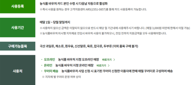 - 온라인 사용: 농식품바우처 쇼핑몰 접속 → 바우처 선택 → 결제